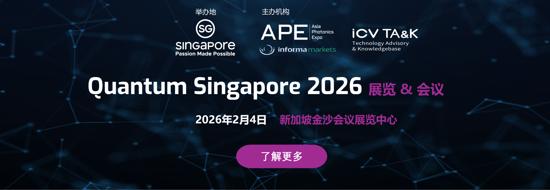 亚洲光电博览会(APE 2026)将于2026年2月4日至6日重返新加坡滨海湾金沙会展中心。作为亚洲领先的光电技术创新平台,APE 2026将全面展示光通信、光学、半导体、激光、红外、传感、量子技术等前沿领域的最新成果。