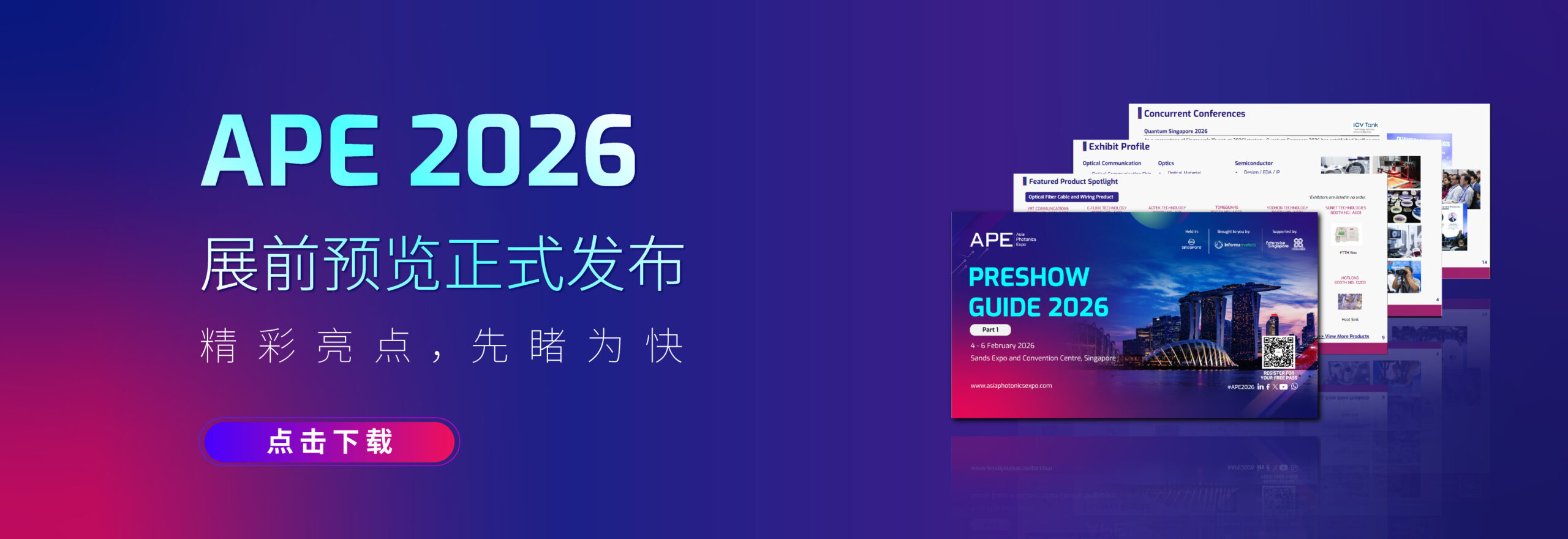 亚洲光电博览会(APE 2026)将于2026年2月4日至6日重返新加坡滨海湾金沙会展中心。作为亚洲领先的光电技术创新平台,APE 2026将全面展示光通信、光学、半导体、激光、红外、传感、量子技术等前沿领域的最新成果。APE 亚洲光电博览会是业界专业人士探索光电全产业链趋势与创新的首选盛会。本届展会将重点打造特色产品展区——量子展区、真空镀膜展区、半导体展区、红外夜视仪展区、激光便携式产品展区和光学元器件展区等,并特设9个国家及地区主题展团,荟萃四大洲全球光电及半导体领域的尖端技术成果。
